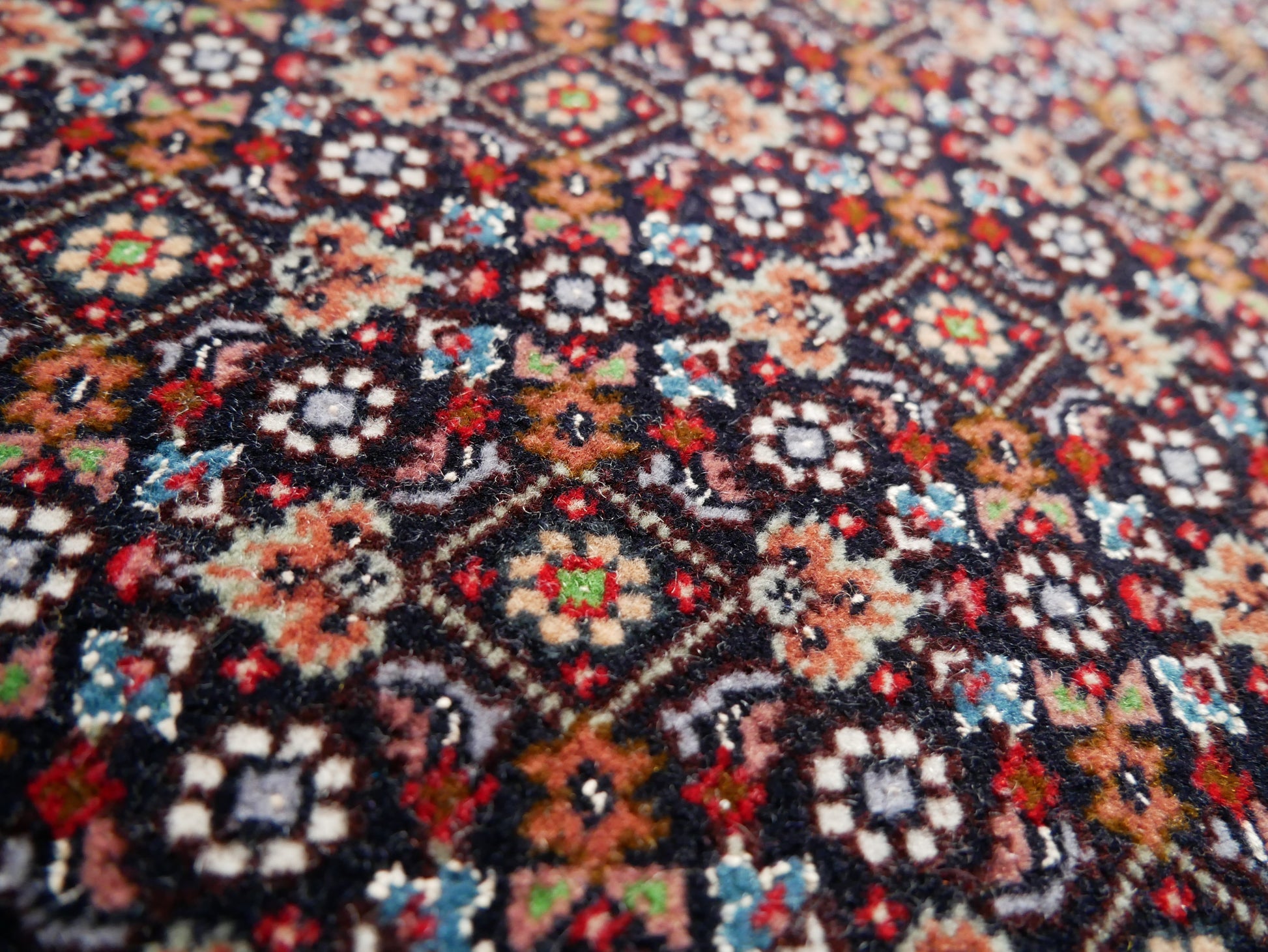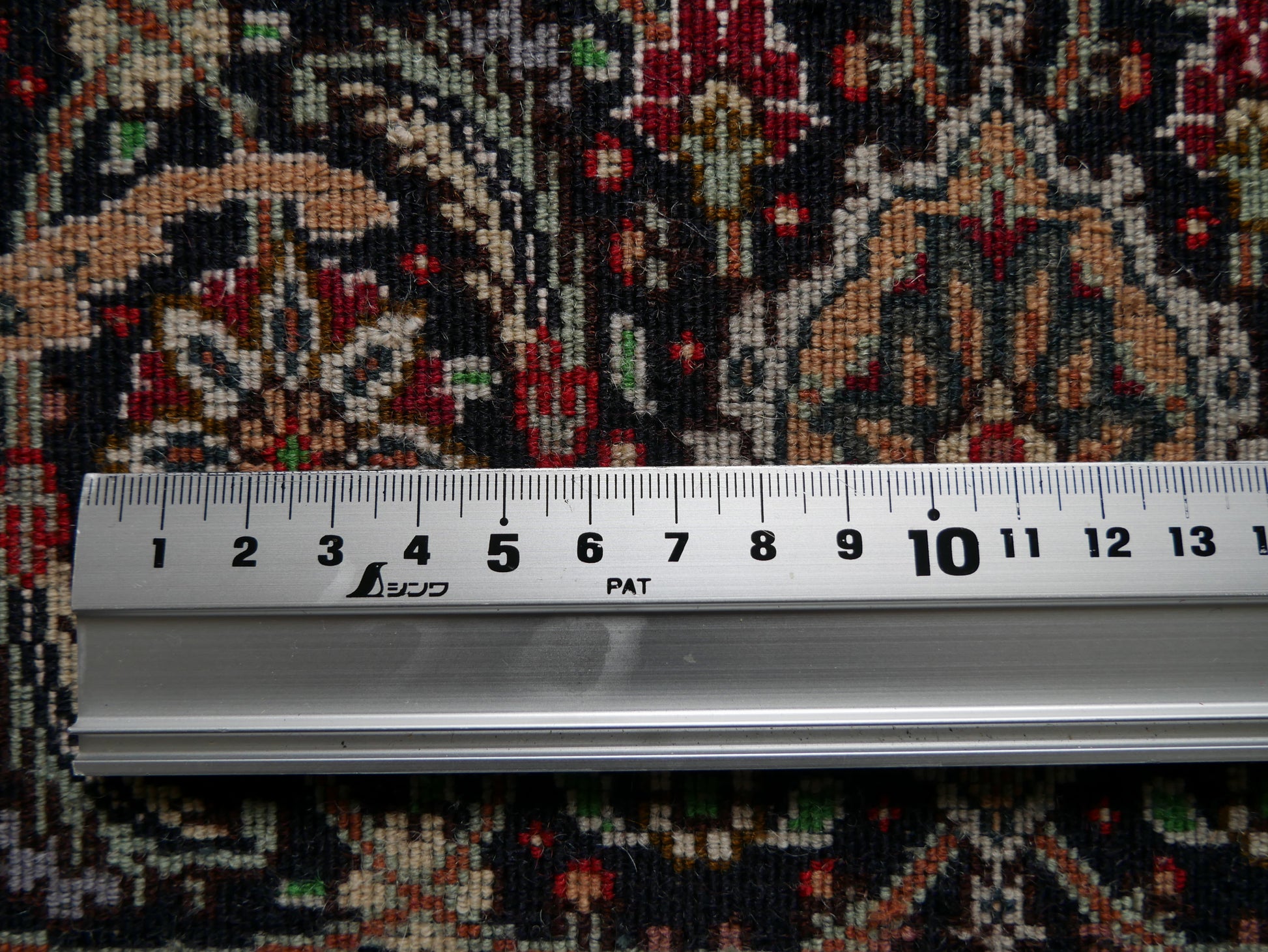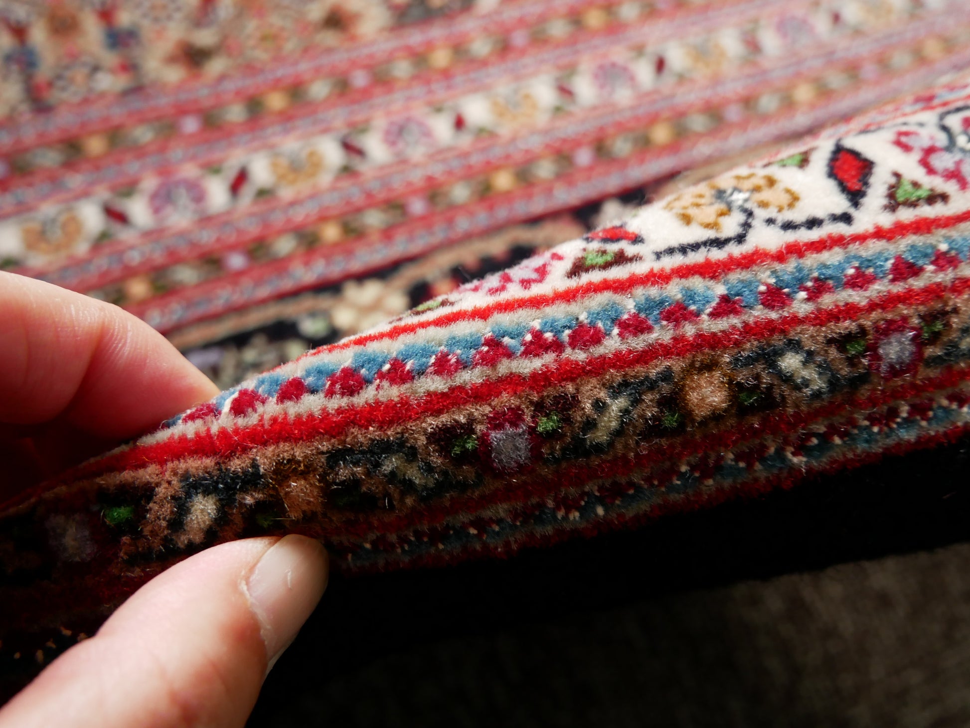 裏側を見てみると、織りの粒の目がとても整っていて緯糸はほぼ見えず、結び目がまるで繋がったビーズのように粒になっています。良いタブリーズ絨毯の特徴です。