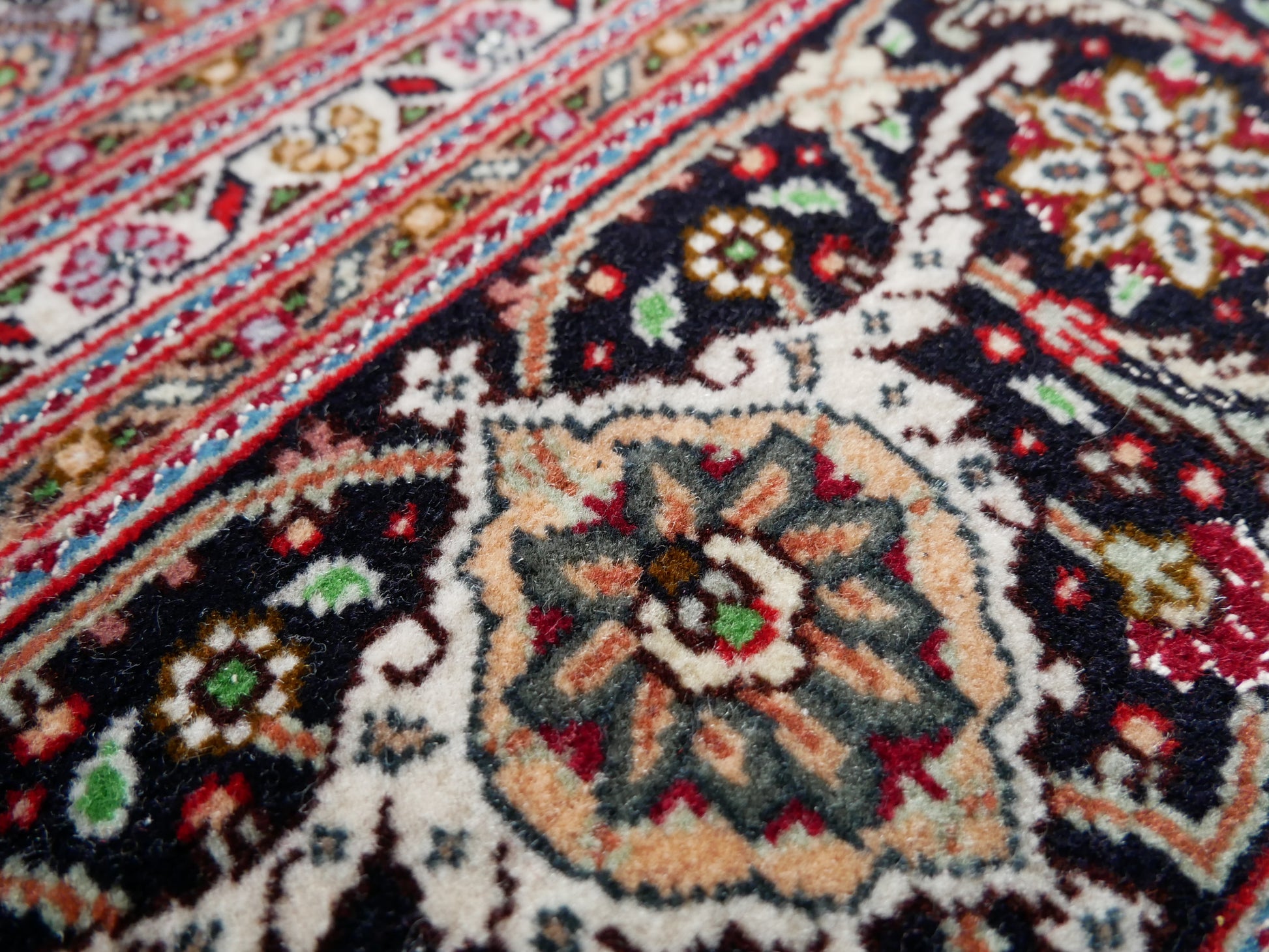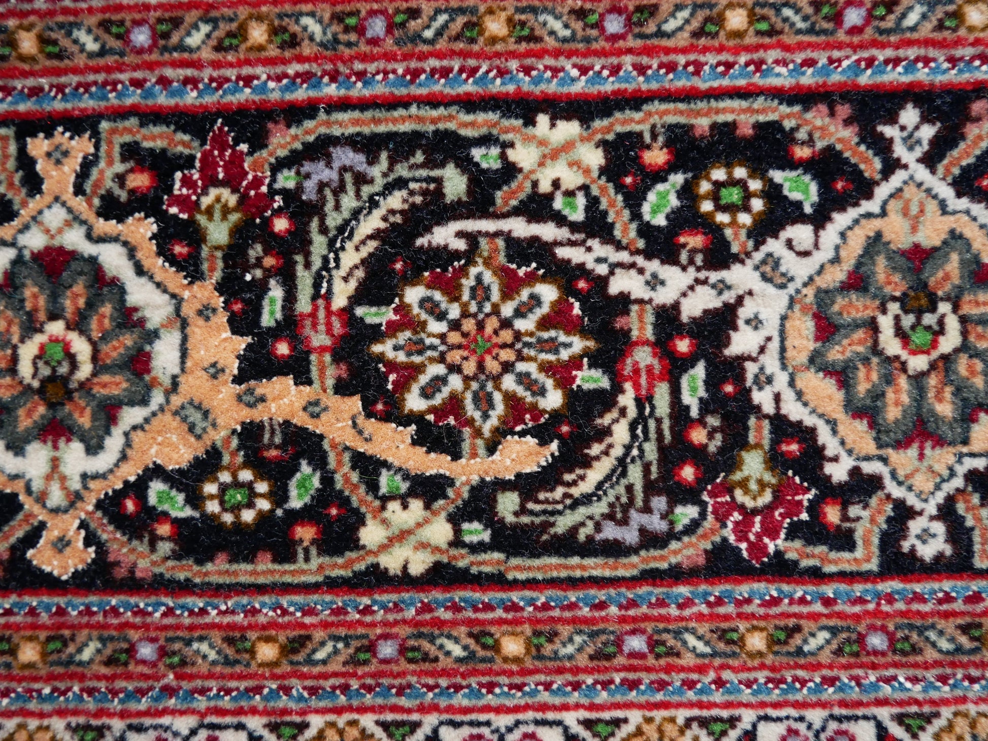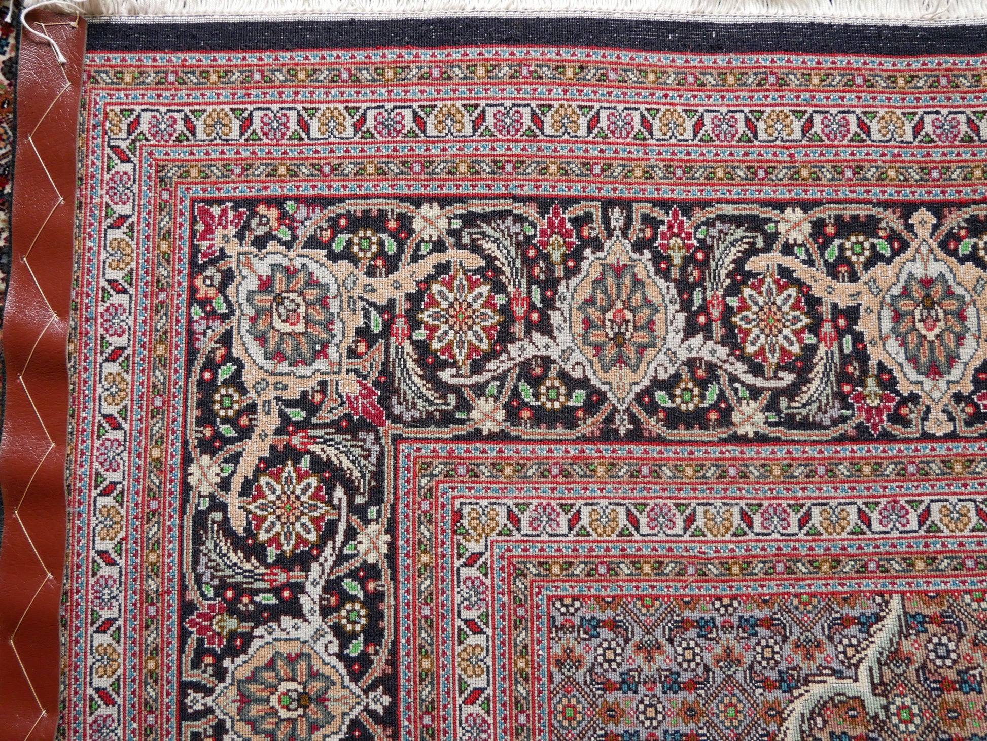 赤、黄緑、ピンク、水色、薄紫、縁取りで光るシルクなど、近づいてみないとわからないこだわりのあるデザイン。色彩センスが抜群です。タブリーズマヒの中でもかなり多色使い。